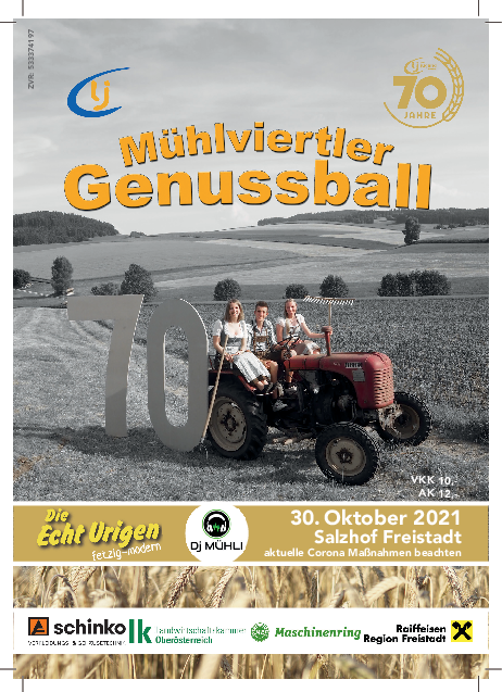 Der Genussball geht in die nächste Runde. Leider mussten wir ihn verschieben und unser 70 Jahr Jubiläum erst 2022 feiern. Aber ganz egal unser Ball wird trotzdem genial. Um 19:30 werden die Ballgäste Herzlich willkommen geheißen. Unter dem Motto „70 Jahre Landjugend Bezirk Freistadt“ werden die Gäste kulinarisch verwöhnt mit heimischen Spezialitäten zum essen und auch zum trinken. Die Volkstanzgruppe Unterweißenbach gibt den Startschuss. Um Mitternacht werden dann die Greabäcka Schuaplattla den Ballsaal aufheizen. Musikalisch wird das ganze natürlich von einer tollen Band umrundet.